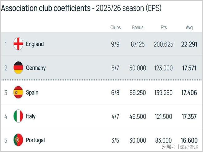 附加賽開始之前,根據(jù)歐洲聯(lián)賽積分榜,英超遙遙領(lǐng)先,比第二名的德甲多出5分以上,葡超排在第三名,隨后是西甲和意甲。兩輪附加賽結(jié)束后,歐洲聯(lián)賽積分發(fā)生不小變化,由于本菲卡兩場失利,葡超沒有球隊需要參加歐聯(lián)杯和歐協(xié)聯(lián)附加賽,無法增加任何積分,已經(jīng)退居第5名,剩下葡萄牙體育、波爾圖和布拉加3隊,相信很難大幅提高積分。